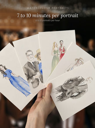 J'arrive environ une heure avant les premiers invités et j'installe un espace d'illustration avec mon matériel d'art. Pendant le cocktail ou le vin d'honneur, les invités sont illustrés en moins de 10minutes.
